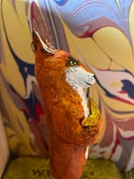 Made from paper clay then painted with acrylic paints and ink. Buffed with a gold lustre and sealed with varnish.