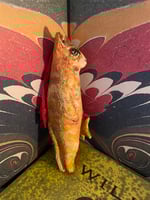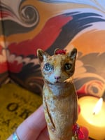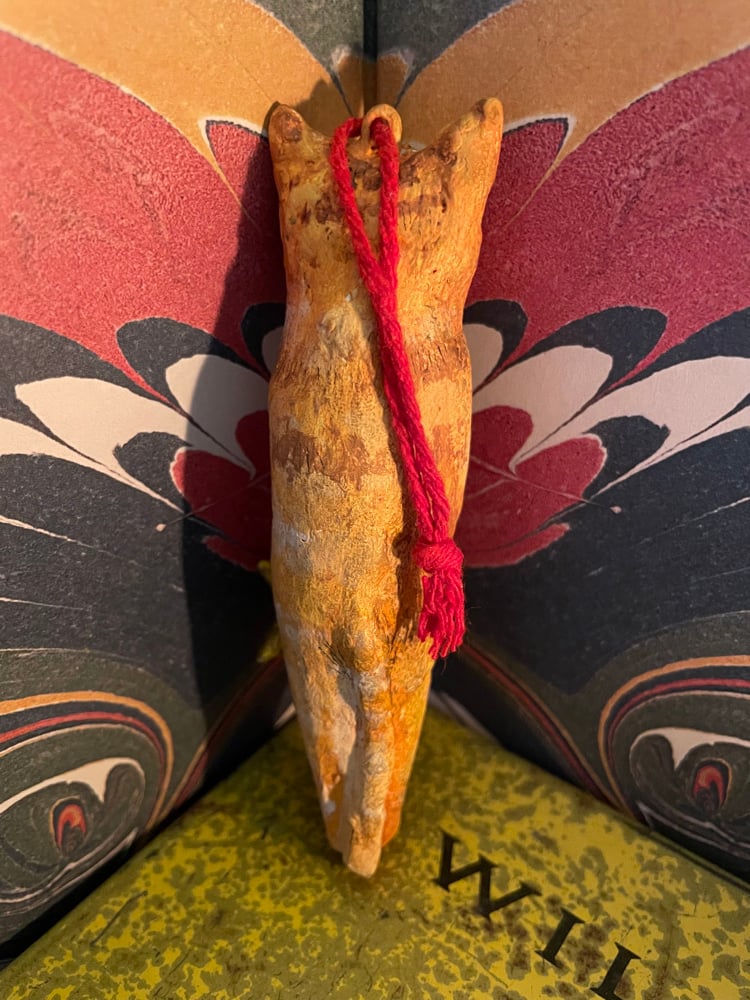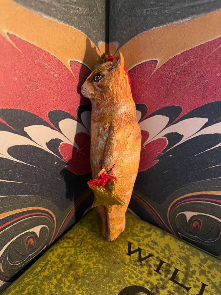Made from paper clay then painted with acrylic paints and buffed with a gold lustre. Sealed with varnish.
